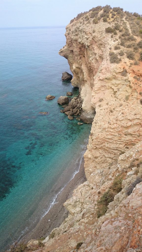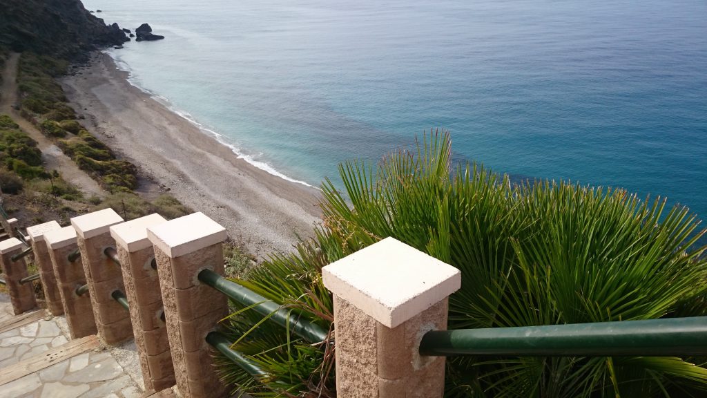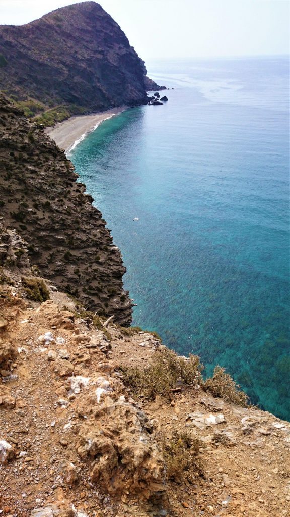 Al final del paseo marítimo se toma la calle que arranca a la derecha y que pronto se volverá camino de tierra, no sin antes subir una pequeña escalinata a la derecha para contemplar la bahía desde el mirador del Peñon de Jolúcar. Volvemos a bajar y continuamos en la dirección prevista. Al poco de pisar tierra encontrarás una senda estrecha a la derecha que debemos tomar par subir al sendero junto a las señales o hitos de deslinde marítimo.